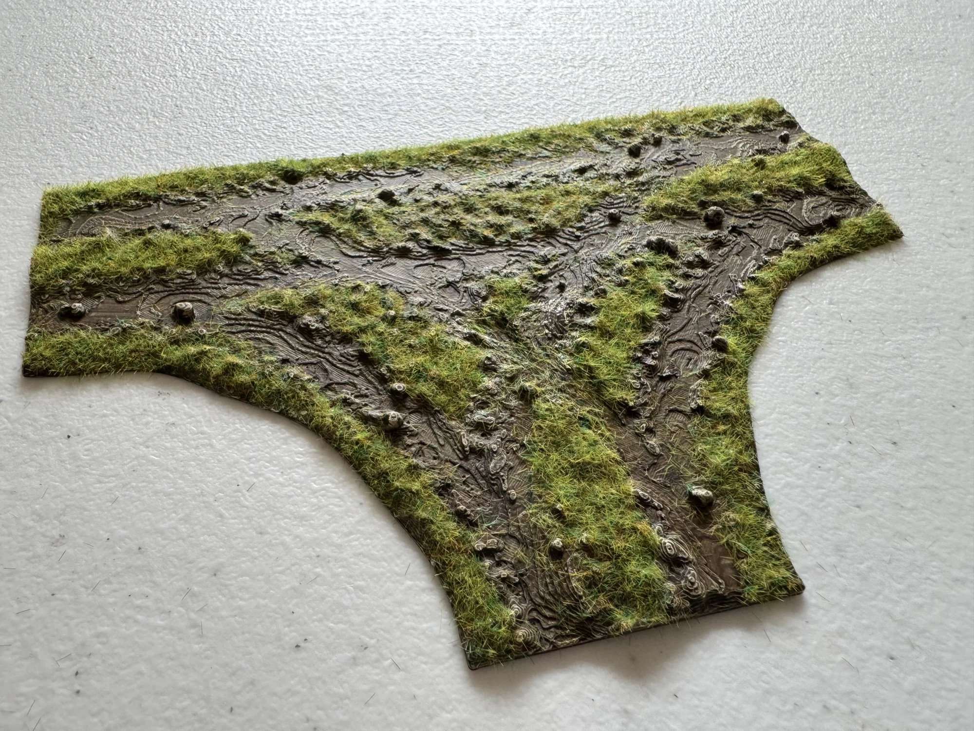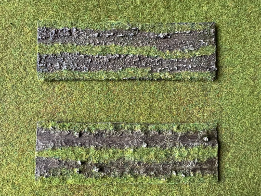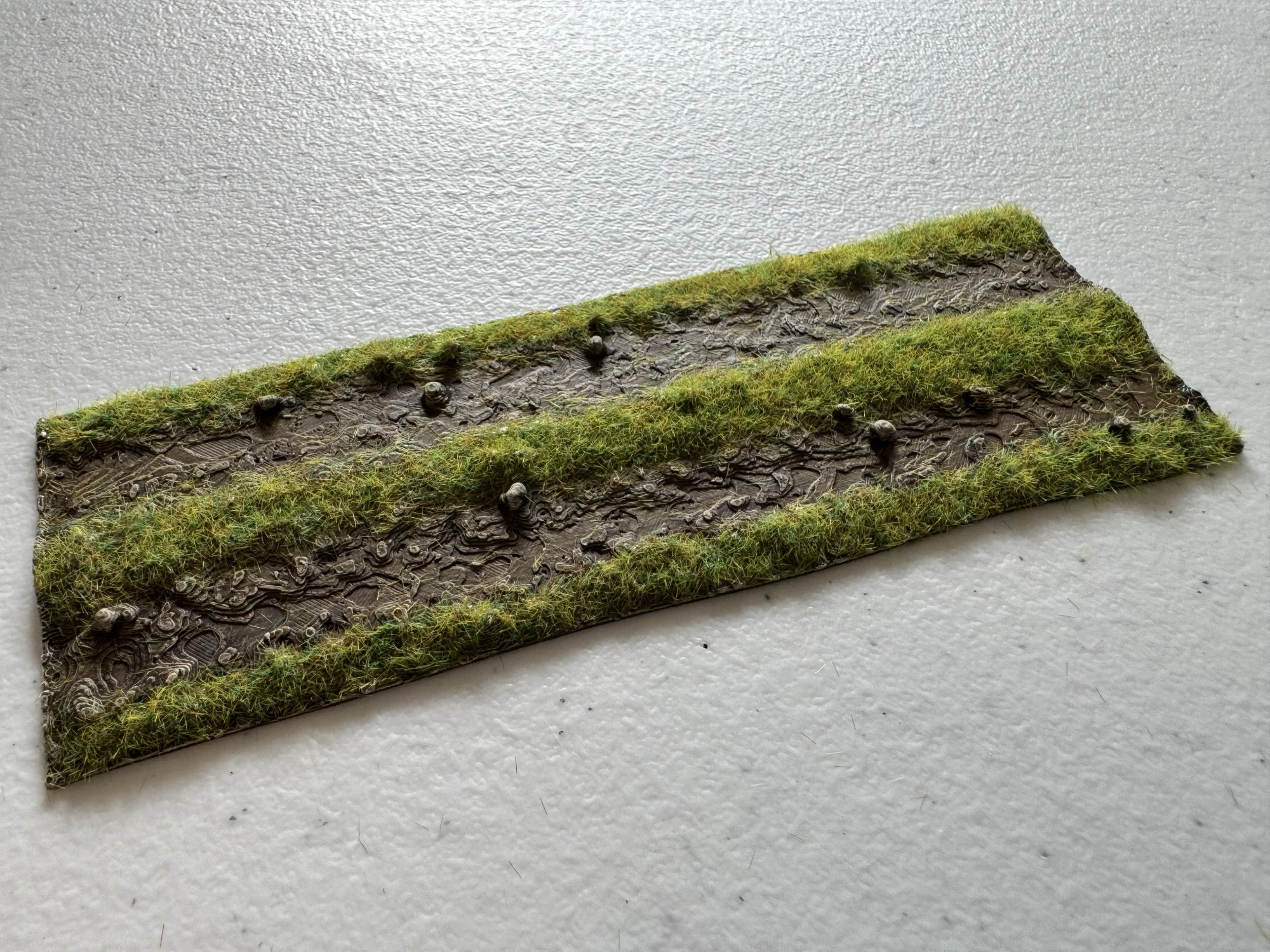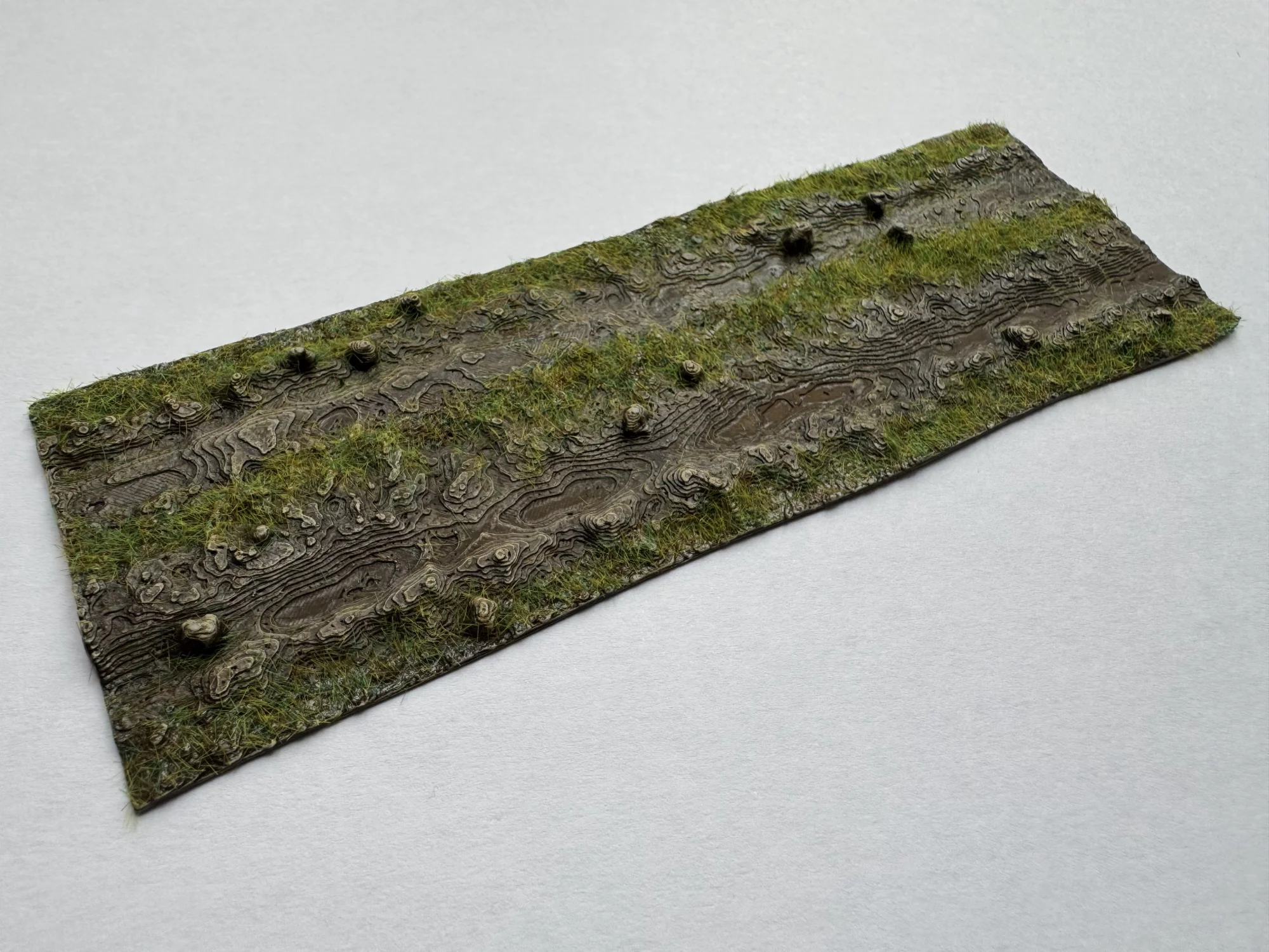 The WarFront Dirt Roads are available in two versions to suit different hobby styles. Fully textured sections feature mud and rock detail modelled directly into the surface, simulating the compression and wear caused by vehicle traffic. These are ideal for hobbyists who want to print, paint, and get their terrain onto the battlefield quickly.