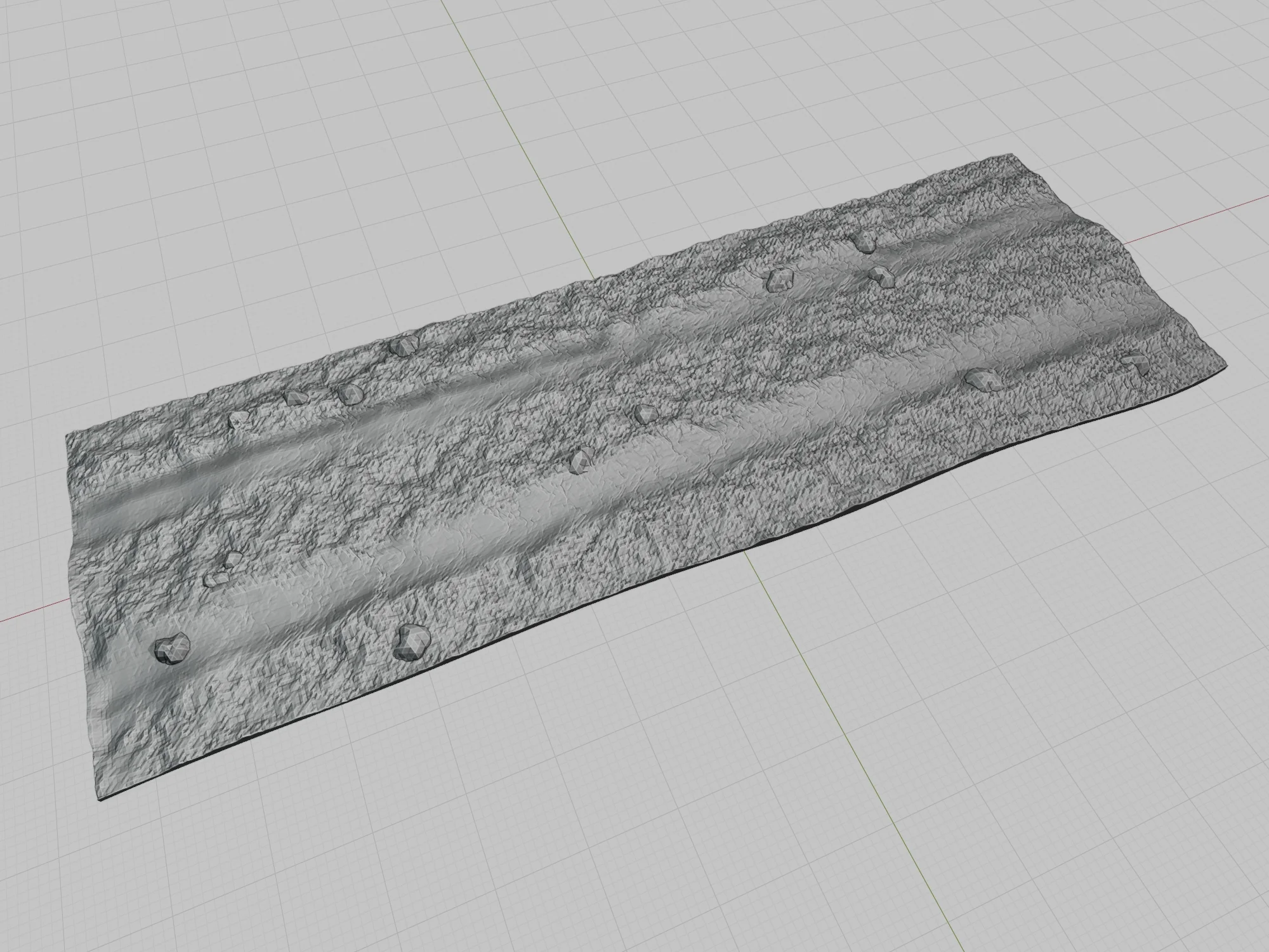 A 6-inch straight piece of dirt road modelled with a mud and rocks texture covering its surface. To avoid repetition on long straight pieces of road, 4 variants of this model have been created with this being variant 1.