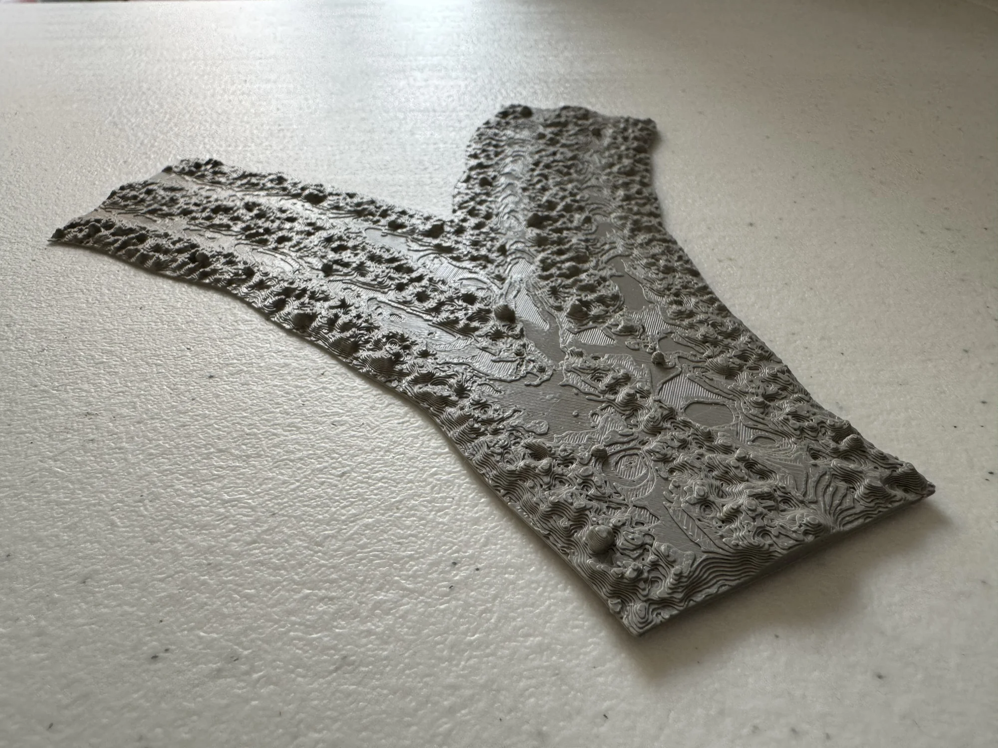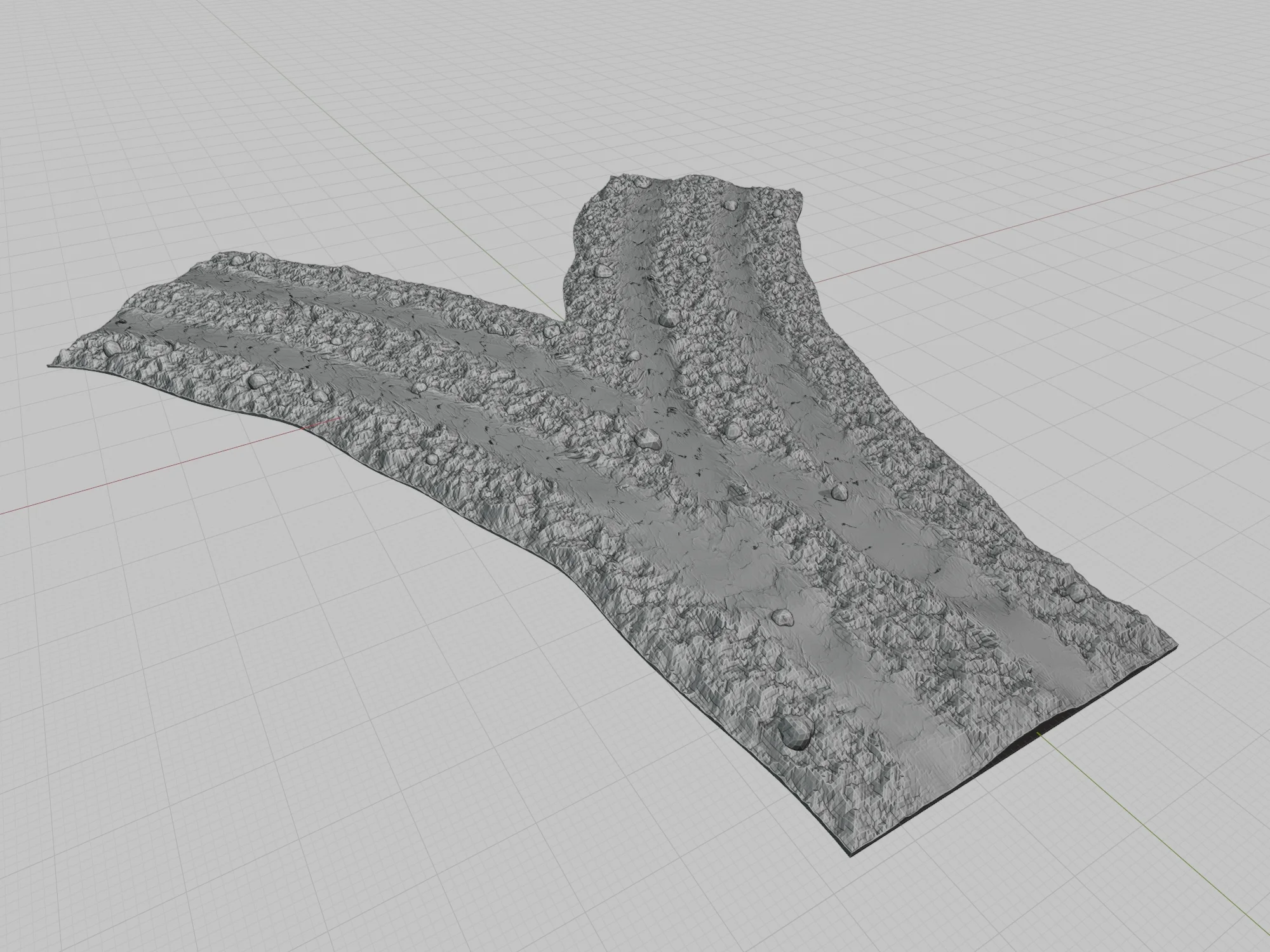 A section of dirt road, modelled with a mud and rocks texture covering its surface and splitting a straight piece of road into two at 45 degrees forming a Y-junction.
