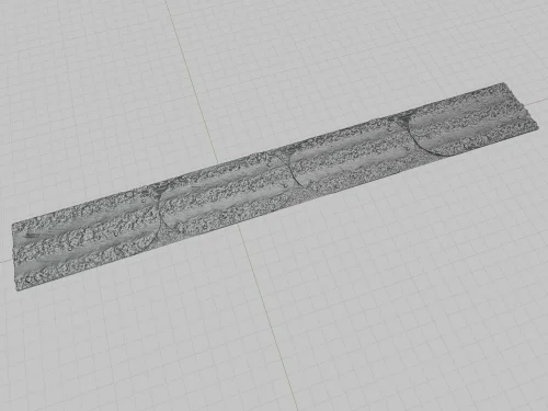 An articulating section of dirt road comprised of 4 sections for a total length of 16-inches and modelled with a mud and rocks texture covering its surface. The flexible nature of this model allows complex organic dirt road layouts to connect seamlessly.