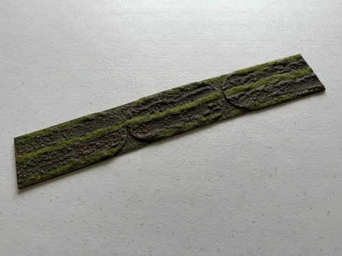 An articulating section of dirt road comprised of 3 sections for a total length of 12-inches. The flexible nature of this model allows complex organic dirt road layouts to connect seamlessly. In this plain version, the mud and rock texture has been removed, leaving a smooth base designed for hobbyists who want to apply their own basing textures and terrain finishes.