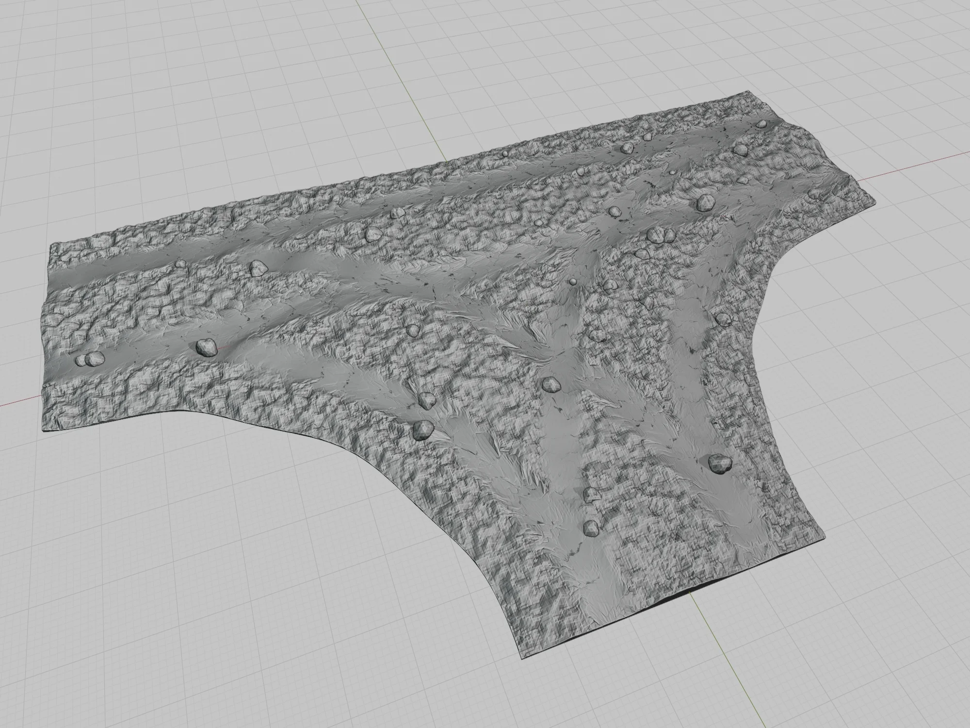 A section of dirt road, modelled with a mud and rocks texture covering its surface and connecting 3 different roads at 90 degrees, forming a T-junction.