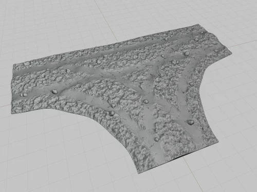 | Crossroads | DR-M-006 | A section of dirt road, modelled with a mud and rocks texture covering its surface and connecting 4 different roads at 90 degrees, forming a crossroads. | Dirt Roads | Crossroads | ||